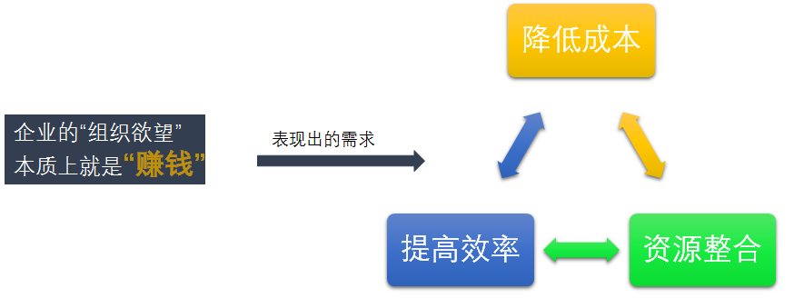 刚刚我们提到,一家企业最终目的就是为了“赚钱”,如何才能让企业“赚钱”呢?抛开企业自身的商业模式,我们需要做的,就是加快企业的运转效率。所以企业的“组织欲望”本质上就是“赚钱”,而表现出来的需求即:降低成本、提高效率、资源整合。